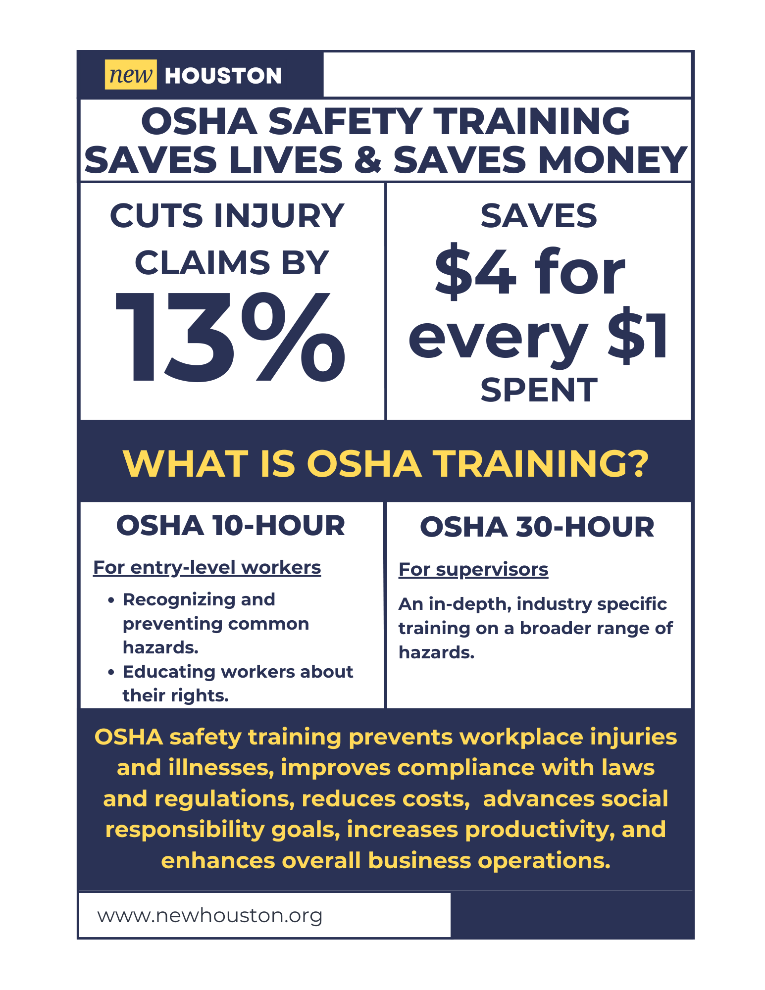 Safety training, alone, is not enough to ensure workplace safety, but requiring all city contractors to provide and pay for safety training is measure proven to both decrease workplace injuries and fatalities for workers and reduce risks and costs to employers. NEW Houston recommends that the City adopt this best practice of requiring contractors on all publicly funded projects to provide OSHA 10 and 30 training to their employers at no cost to the employees. This will lead to better outcomes for workers, employers, and communities.